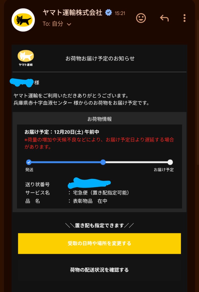 70回の時同様いきなりヤマト郵便からメールで