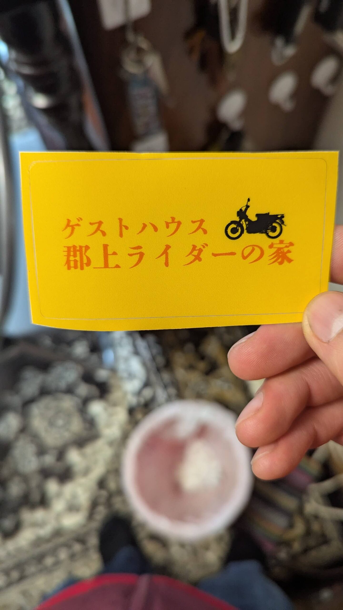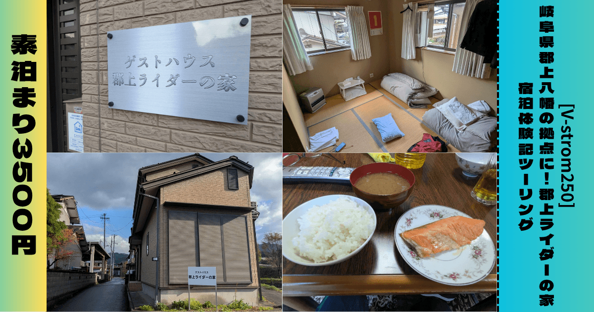 「ゲストハウス郡上ライダーの家」の看板があります - 素泊まり3500円 朝、夕各+500円一泊2食付きにすると4500円
