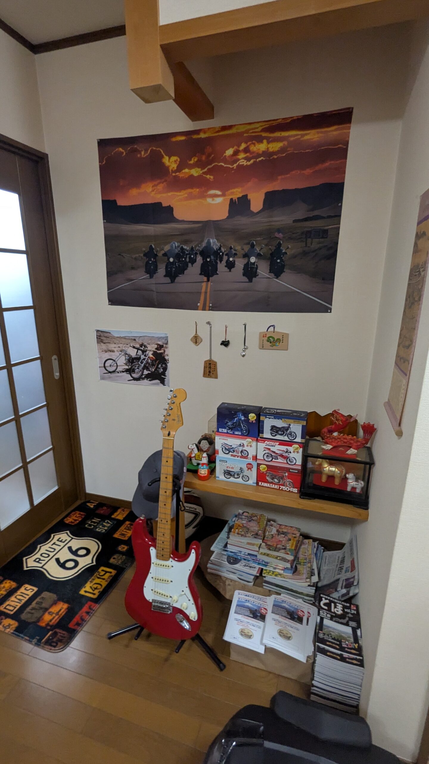ライダーグッズが展示されまるでバイクミュージアムのような雰囲気です。