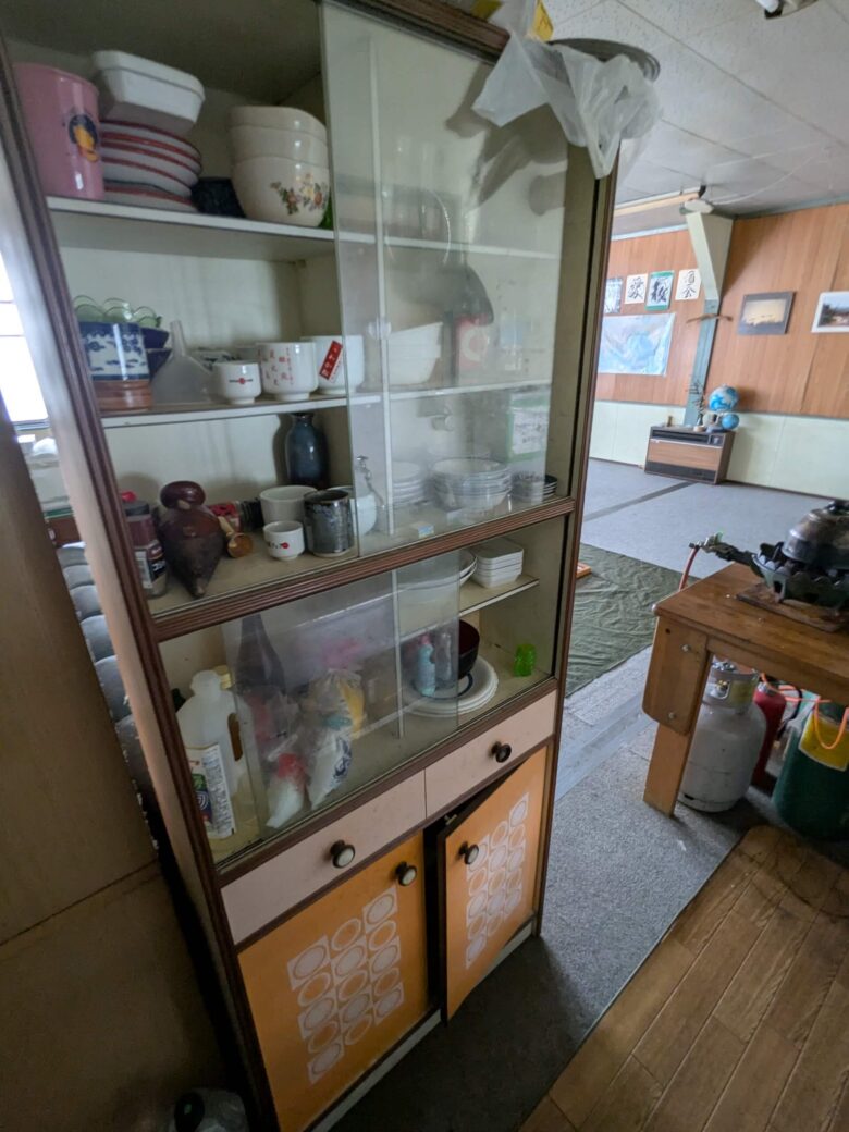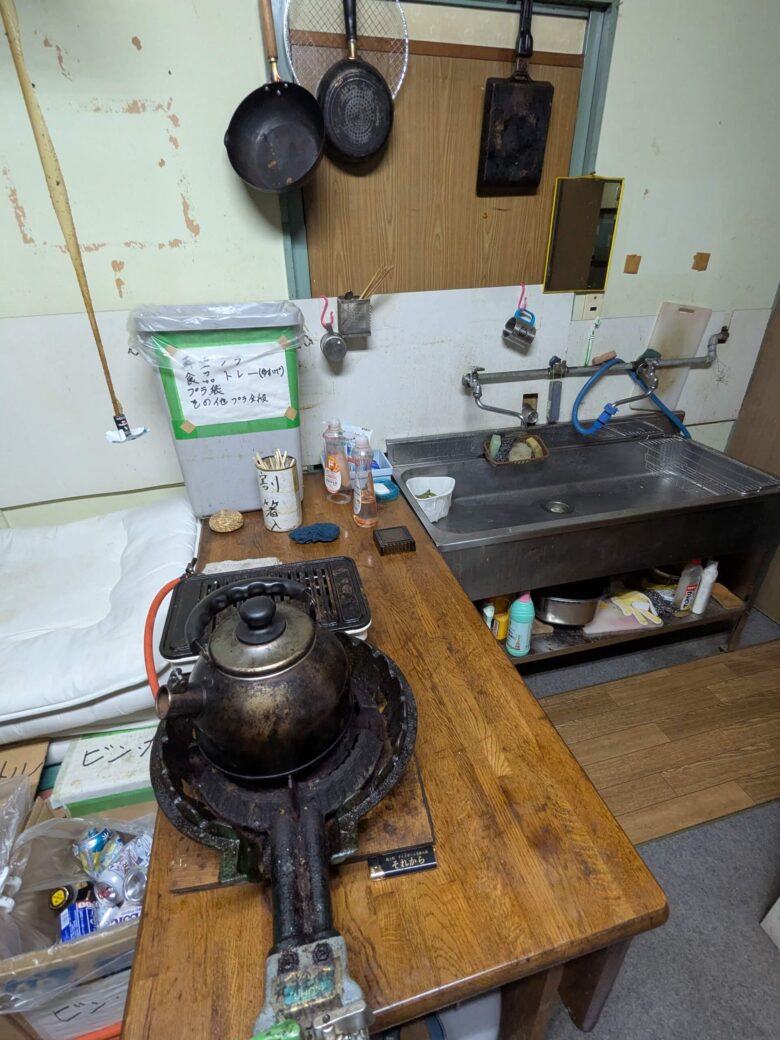 自炊設備: プロパンガスコンロ、大きな冷蔵庫、電子レンジ、電気ポットが