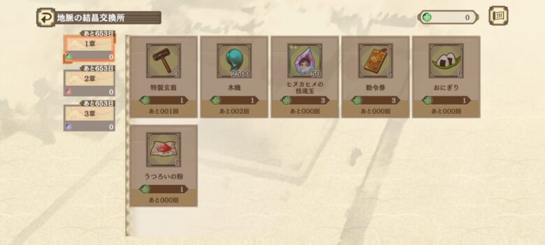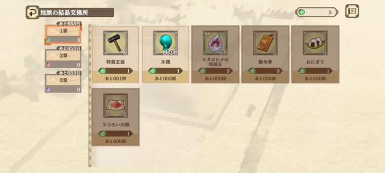 結晶が揃えば、地脈の結晶交換所で全報酬を交換可能になります。