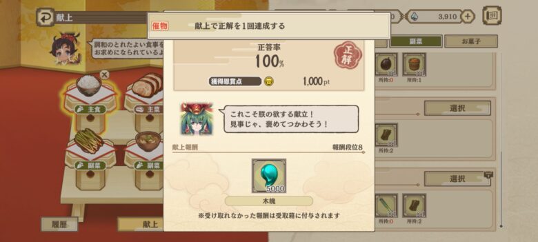 最初の正答率100%献上品一覧