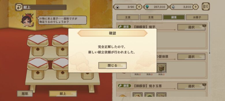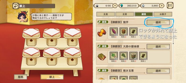 最初の献上品を作る時は選択の所にロックマークがないかよく見よう!