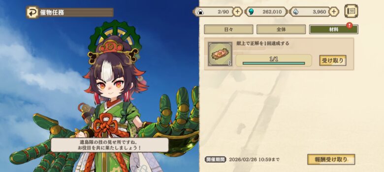 催物任務全体の材料は新しく献上できる