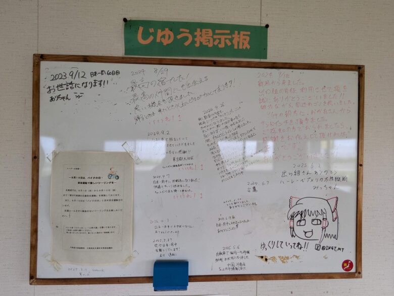 壁のメッセージボードには、ここを訪れた旅人たちのコメントがびっしり並んでいて、